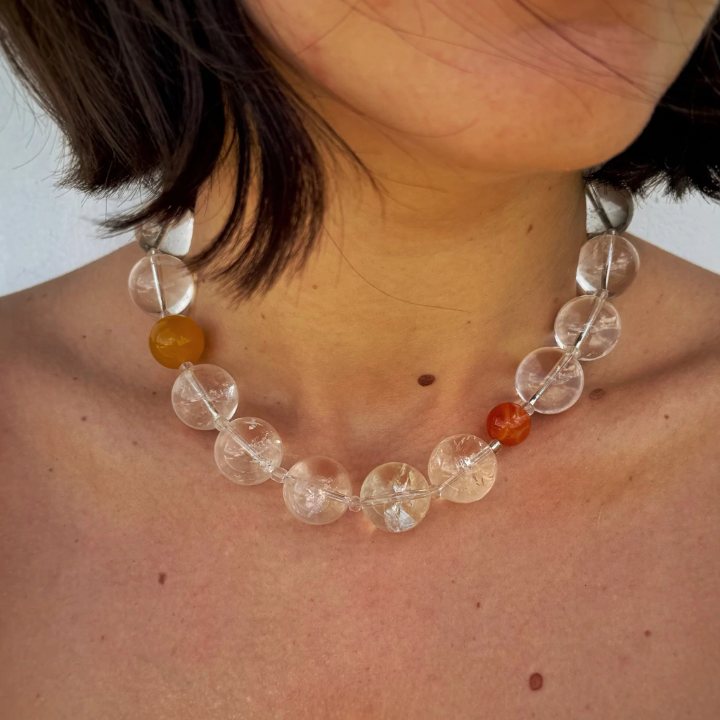 Cuarzo cristal, jade amarillo, ágata, y cornalina.